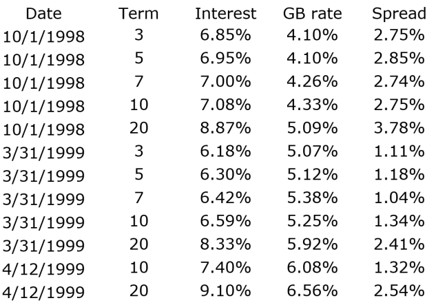 The implied spreads for the Oct. 1, 1998, loans were generally less than 3%, while the implied spreads for the March 31, 1999, loans were generally just over 1%. The implied spreads on the 20-year terms, however, were somewhat higher.